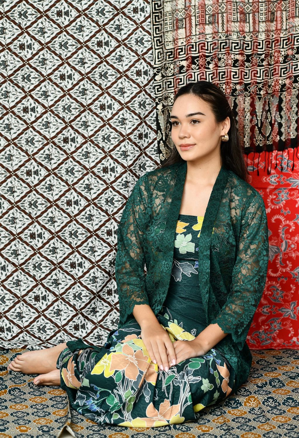 The Long Lace Kebaya is a three-piece set featuring a tube top, a pareo skirt, and a delicate lace outer to complete the look. Each piece and colour pairing was chosen with intention, creating a soft, divine feminine silhouette. The set also comes with a brooch, allowing you to style the kebaya with or without it.